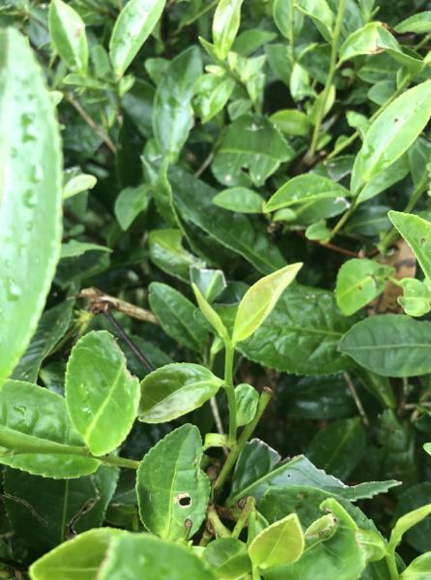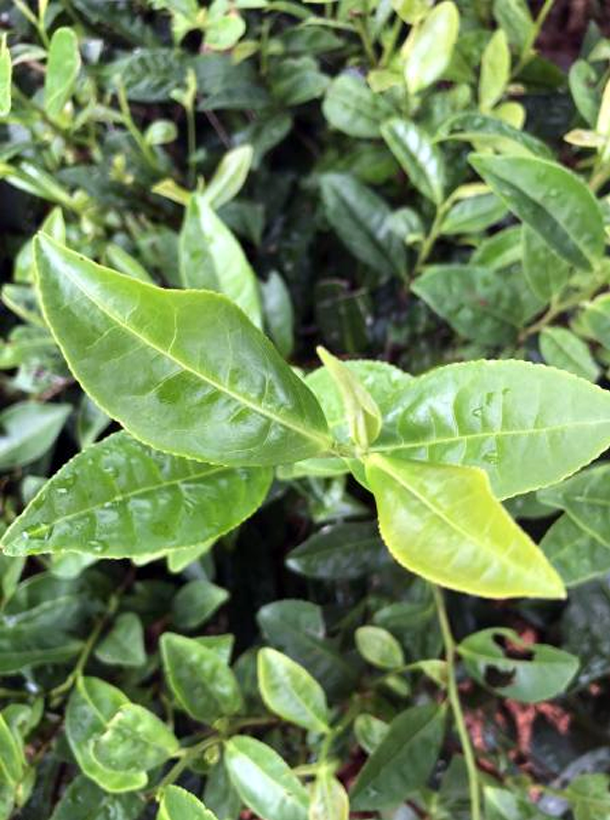 半喬木型,中葉類。植株主干較明顯,樹姿半開張,分枝密,根系發(fā)達。葉片著生近水平,葉長橢圓形;葉身平,葉面隆起,葉緣微波,成葉中綠色,富光澤;葉質(zhì)厚,較柔軟,葉尖漸尖。新梢綠色,茸毛多,持嫩性強,單芽百芽重約 9 克,一芽三葉百芽重約 93 克。