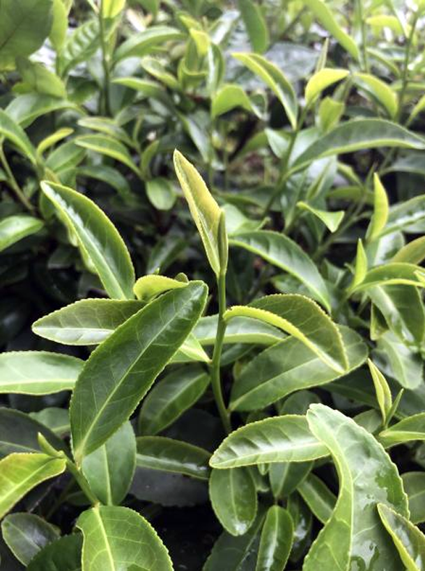 灌木型、小葉類、早生種。植株樹姿半開張,分枝密,葉姿上斜。葉片呈長橢圓形,葉尖較鈍,葉面微隆起,葉色黃綠,富光澤,葉肉較薄,葉質柔軟,側脈明顯,鋸齒較粗、整齊,葉緣微波,芽葉纖細,色黃綠,嫩葉內折。